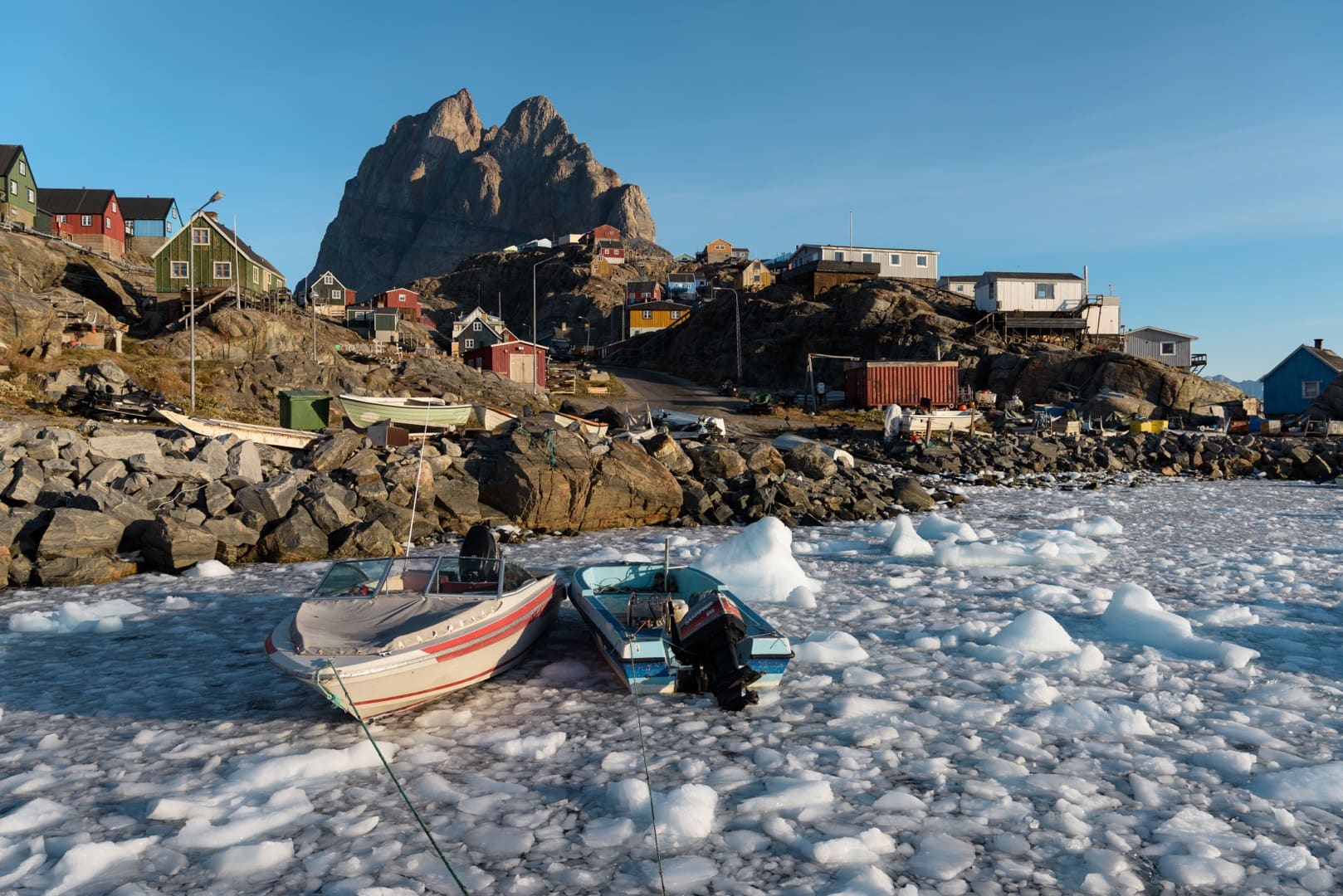 - Diskobucht: Farbige Fischerboote vor den mächtigen Eisbergen